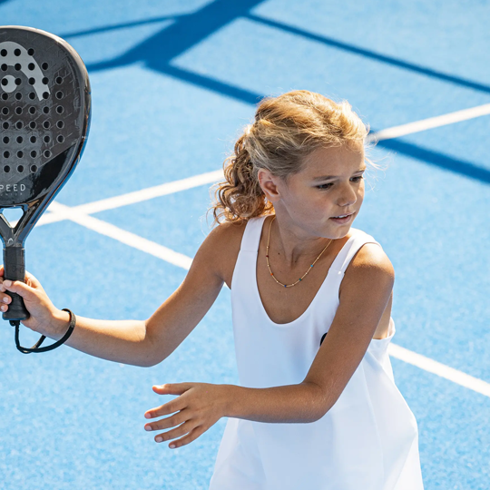 Touch, accuracy and attacking speed are combined in the upgraded SPEED JUNIOR padel racquet, which is recommended for competitive juniors who are 10 or older. Lighter and with a lower balance for improved maneuverability – which makes it easier to handle than adult models – this oversized, teardrop-shaped racquet also offers extra comfort. It’s made with Power Foam and has a fiberglass hitting surface for softer feel and touch. While the Innegra technology enhances shock absorption and stability, the Integrated Protector System extends the racquet’s lifetime by protecting against chips and scratches. The design has been updated for a fresh, premium and distinctive look.